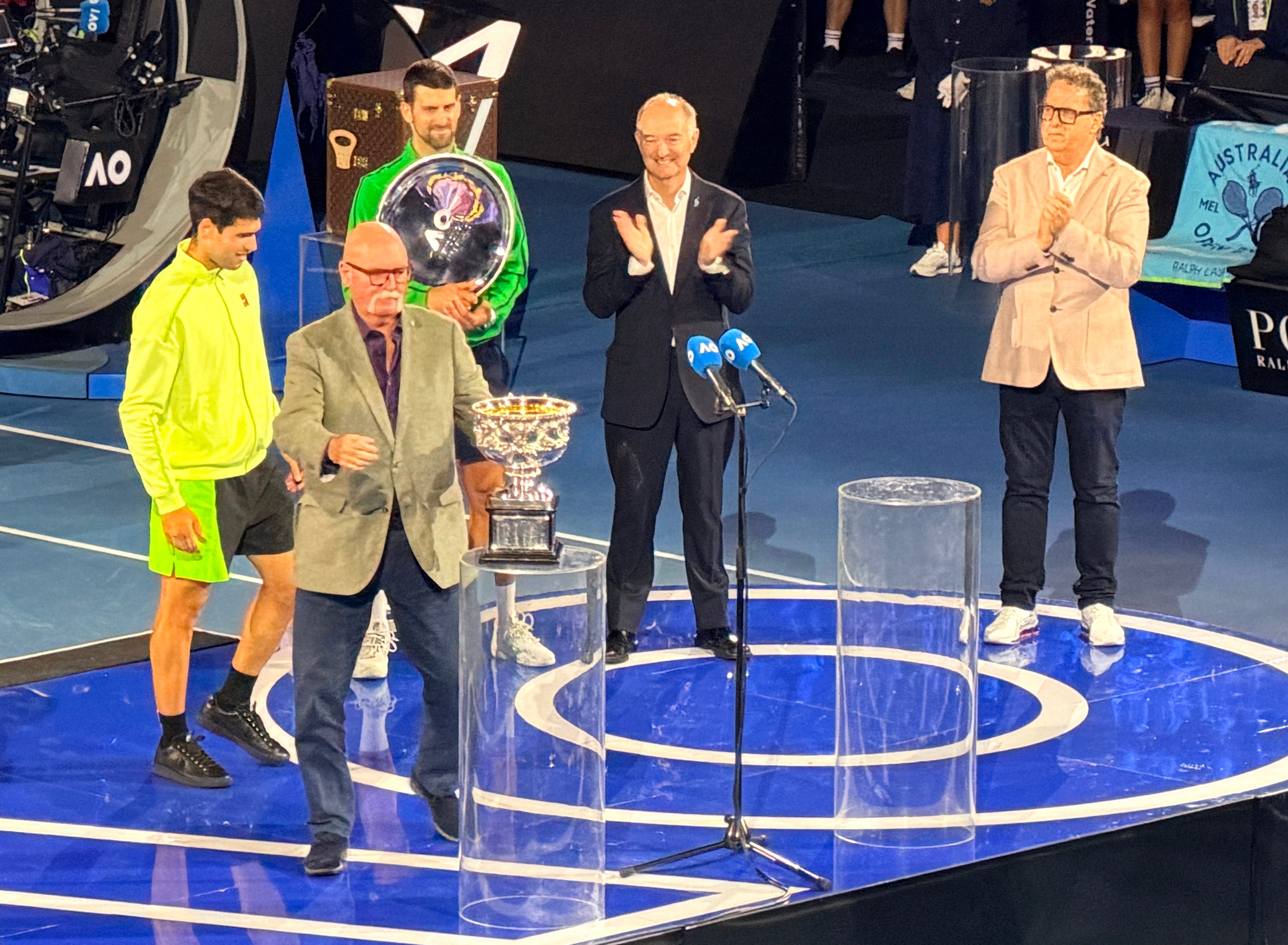 Djokovic was followed onto the stage by Carlos Alcaraz, who had just beaten him in four sets—2-6, 6-2, 6-3, 7-5—to win his first Australian Open title, thereby becoming the youngest-ever male player to complete a Career Slam at just 22 years old.