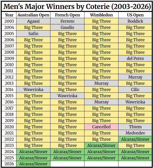 In this era of men’s tennis, having a historic superlative to your name feels like table stakes for winning a major. After all, it’s now 17 majors in a row that have been won by either the Big Three or the new Alcaraz-Sinner duopoly; that’s the second-longest streak by the two coteries since the Big Three reeled off 18 in a row from the 2005 French Open (Rafael Nadal’s first major title) through 2009 Wimbledon (Federer’s 15th major, which broke Pete Sampras’s previous record of 14; Sampras now sits in a distant fourth).