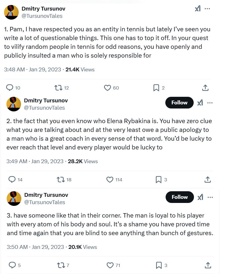 Wow. Okay. So, sorry this response is a little delayed. Reading Tursunov’s tweets, which I had somehow never seen before, made me so incredibly angry that I forgot how to function for a while. Of course everyone who makes it to the top of any sport has gotten a lot of help; but if you are singling out one person the most (or SOLELY) responsible for the success? IT IS THE ATHLETE WHO IS ACTUALLY DOING THE WORK.