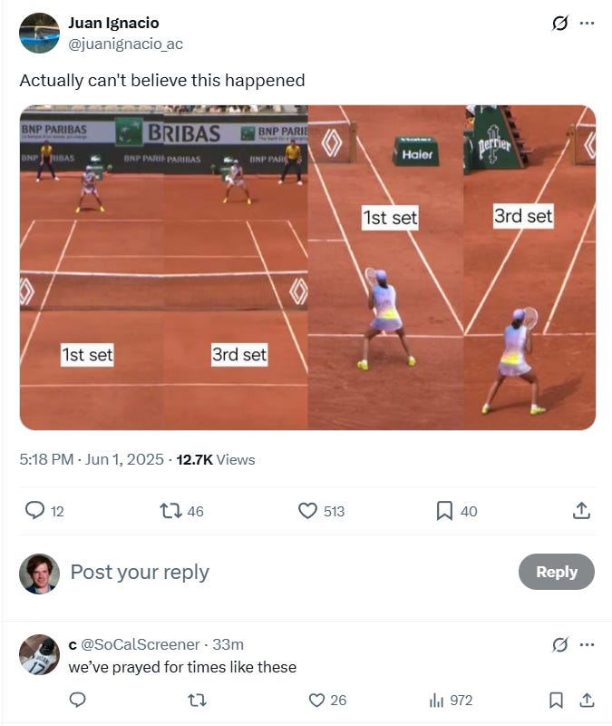 I found a theory that seemed to check out: Swiatek, who coincidentally turned 24 yesterday, had won 24 straight French Open matches to win the last three titles in a row and reach the third round this year. But upon closer examination, Swiatek had somehow managed to avoid facing any highly-ranked power player during that run of invincibility. She hadn’t faced the likes of Rybakina—or Aryna Sabalenka, or Madison Keys, or Jelena Ostapenko, or Karolina Pliskova, or Liudmila Samsonova, or Danielle Collins, or Ekaterina Alexandrova—and so on, the practitioners of what Mary Carillo famously coined “Big Babe Tennis.”