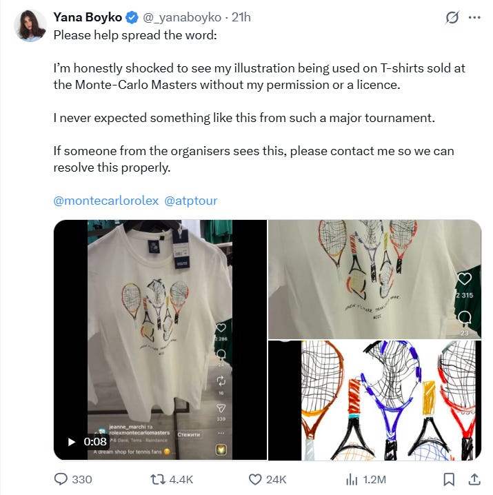 Yana Boyko, a Ukrainian illustrator who left her war-torn hometown of Dnipro last year for Portugal, posted about one of her designs being used without permission on merchandise being sold at the Monte Carlo Country Club’s boutique. Boyko’s post went viral, earning more than 1.2 million views and 4.4k retweets at the time of publication (massive amounts in this degraded, anemic era of Twitter).